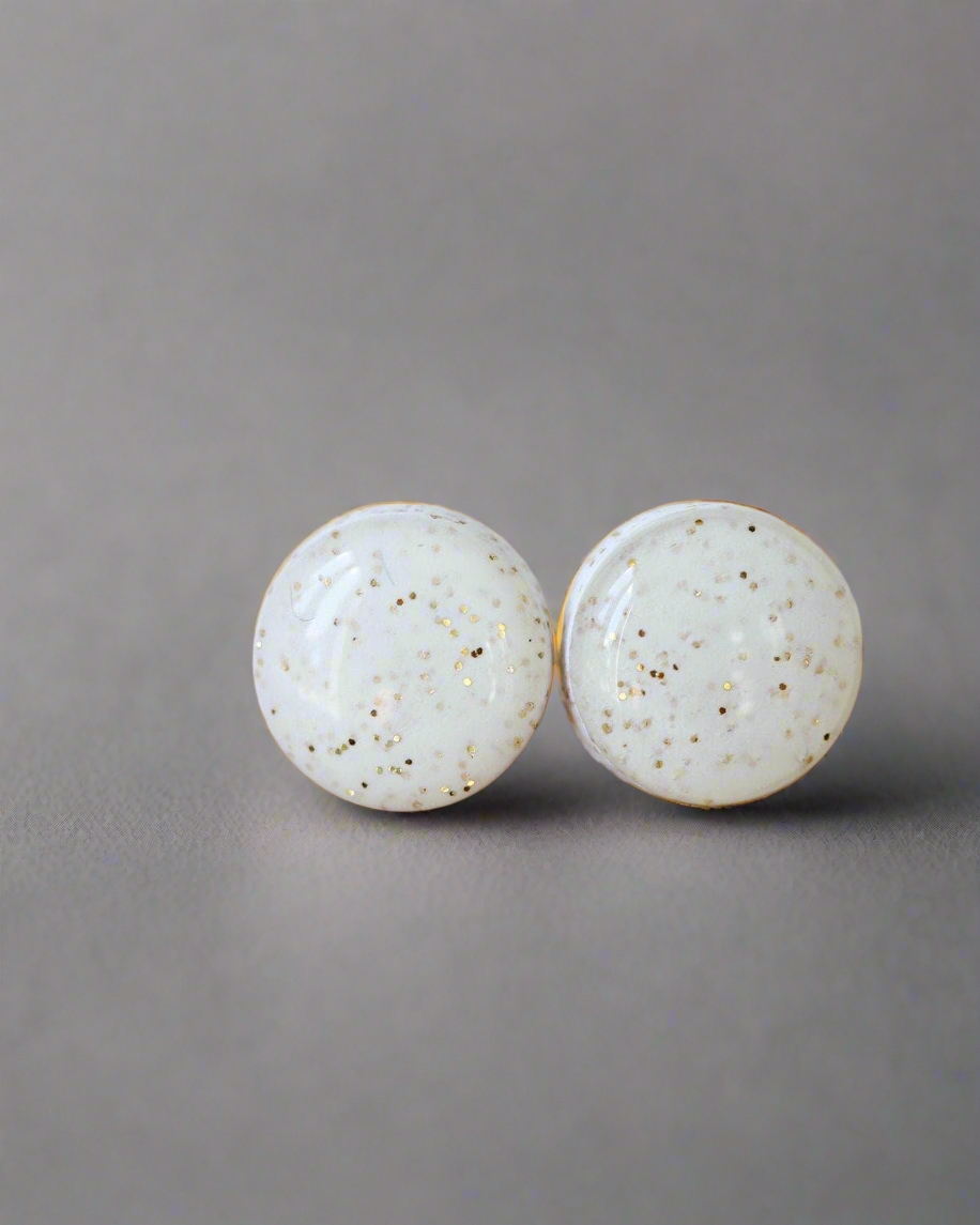 These delicate white sparkle stud earrings are unique and truly spectacular. Put a glamorous finish on your look with these delicate gold glitter earrings. Made with surgical hypoallergenic steel base, these earrings are perfect for everyday wear or a special evening out. This pair of stud earrings are perfect for giving to a special someone or as a gift to yourself.