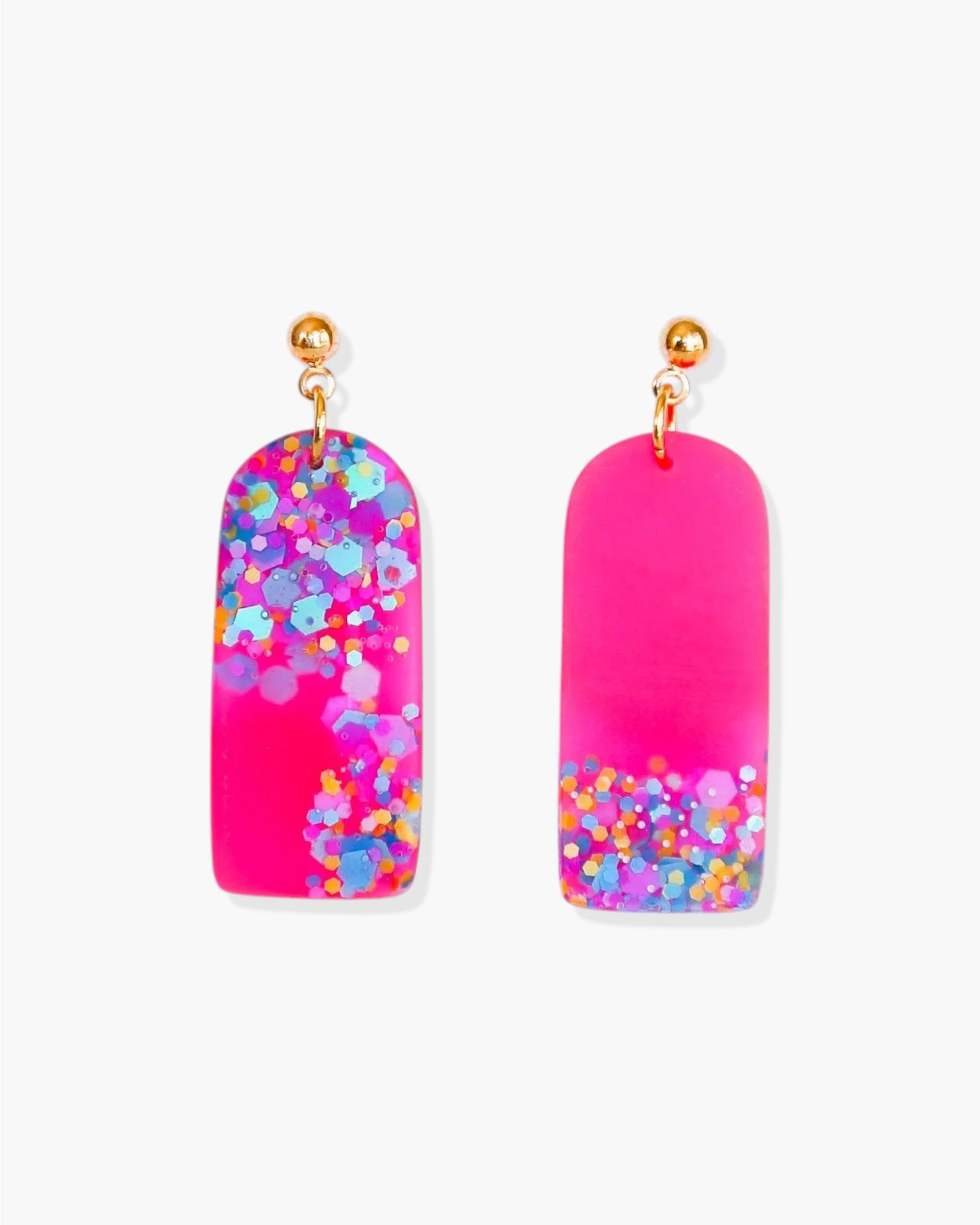 These pink bar earrings with colorful glitter are bright and beautiful, and perfect for any occasion. Made with crystal resin, they catch the light beautifully. They're also lightweight and comfortable to wear. Whether you're dressing up for a night out or simply accenting your everyday style, these earrings are a great choice. Plus, they make a great gift for any special girl in your life. So don't hesitate - treat yourself or someone you love to a pair of these pretty hoops today!